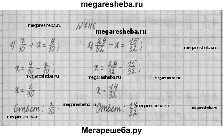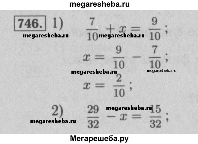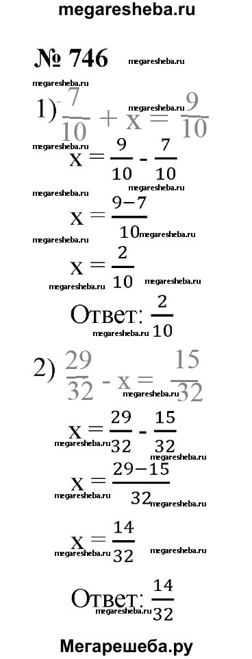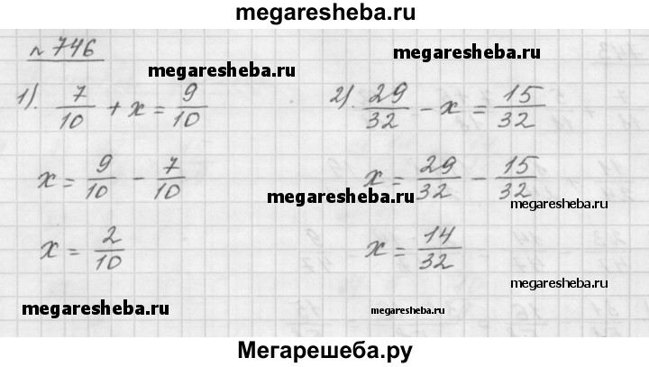 746. Решите уравнение: 1) 7/10+x=9/10; 2) 29/32-x=15/32.