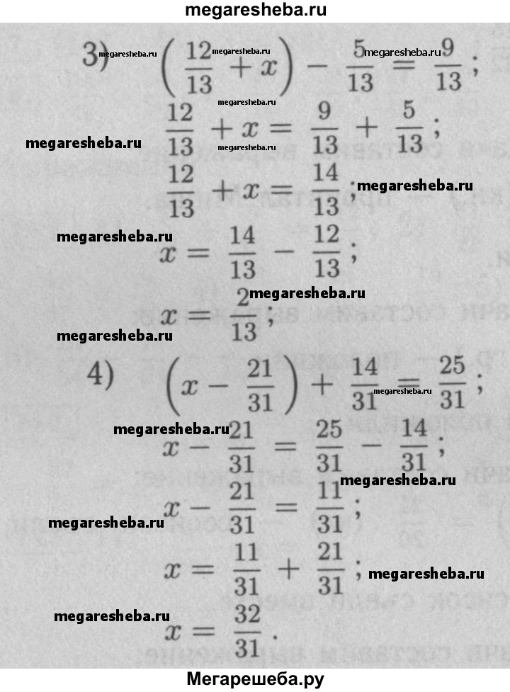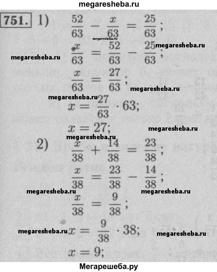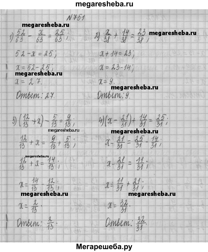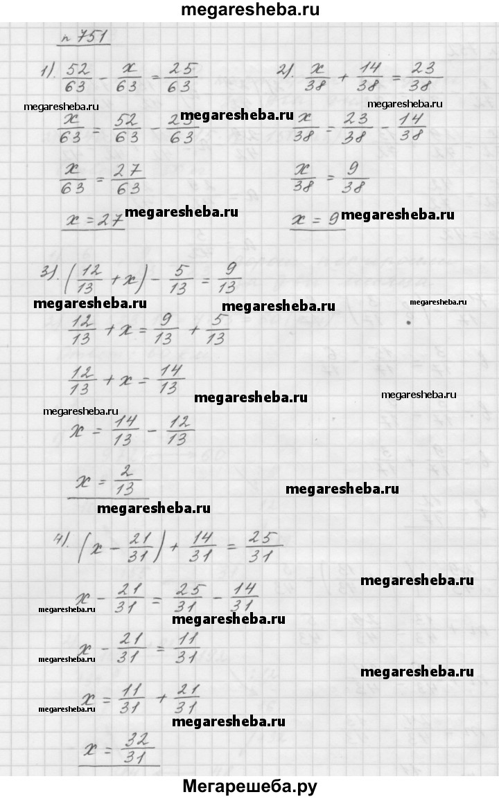 751. Решите уравнение: 1) 52/63-x/63=25/63; 2) x/38+14/38=23/38; 3) (12/13+x)-5/13=9/13; 4) (x-21/31)+14/31=25/31.