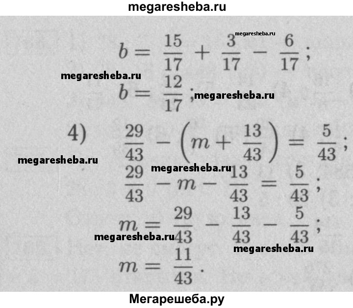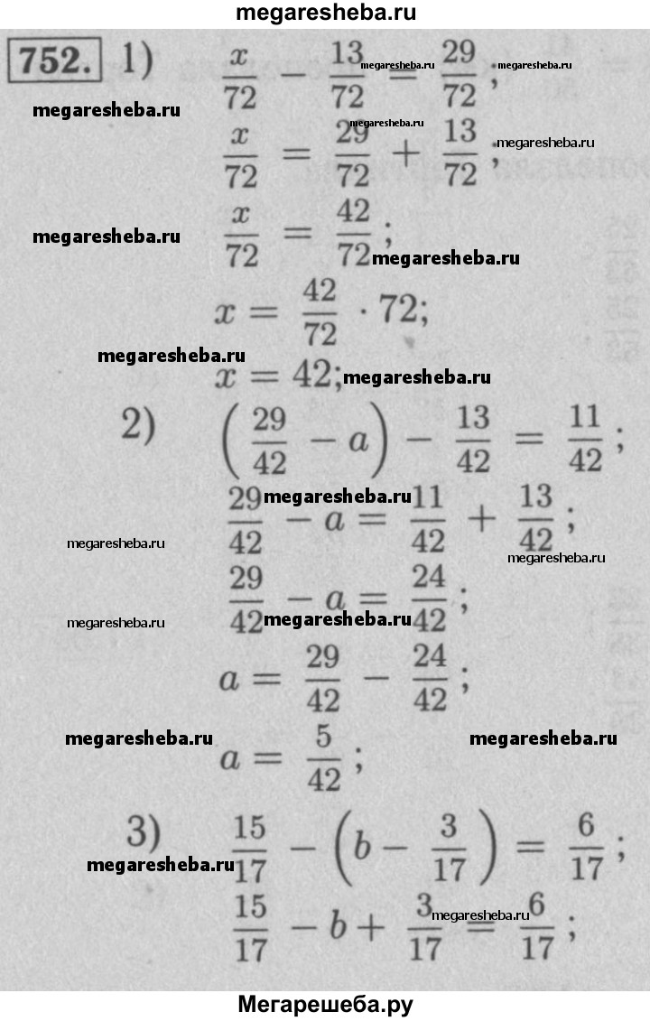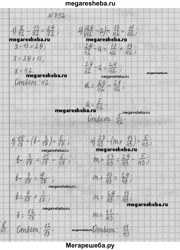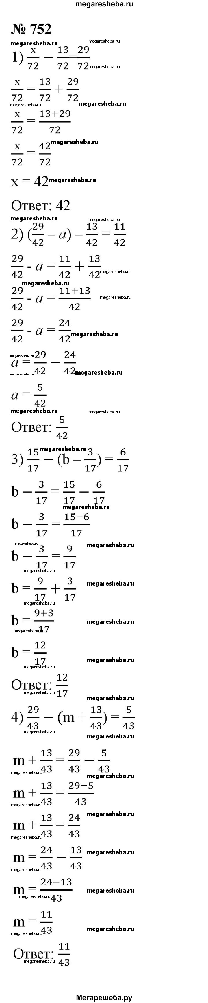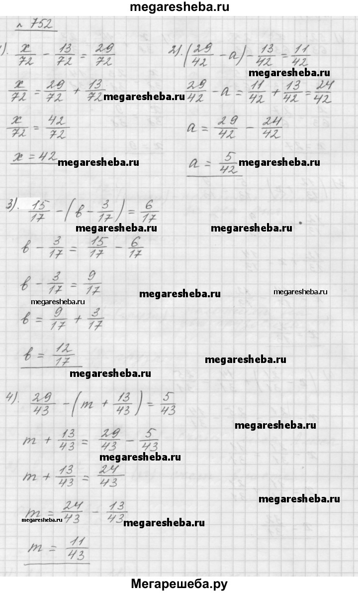 752. Решите уравнение: 1) x/74-13/72=29/72; 2) (29/42-a)-13/42=11/42; 3) 15/17-(b-3/17)=6/17; 4) 29/43-(m+13/43)=5/43.