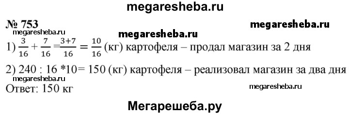 753. Овощной магазин реализовал 240 кг картофеля. В первый день было продано 3/16 картофеля, а во второй —7/16. Сколько килограммов картофеля магазин реализовал за два дня?