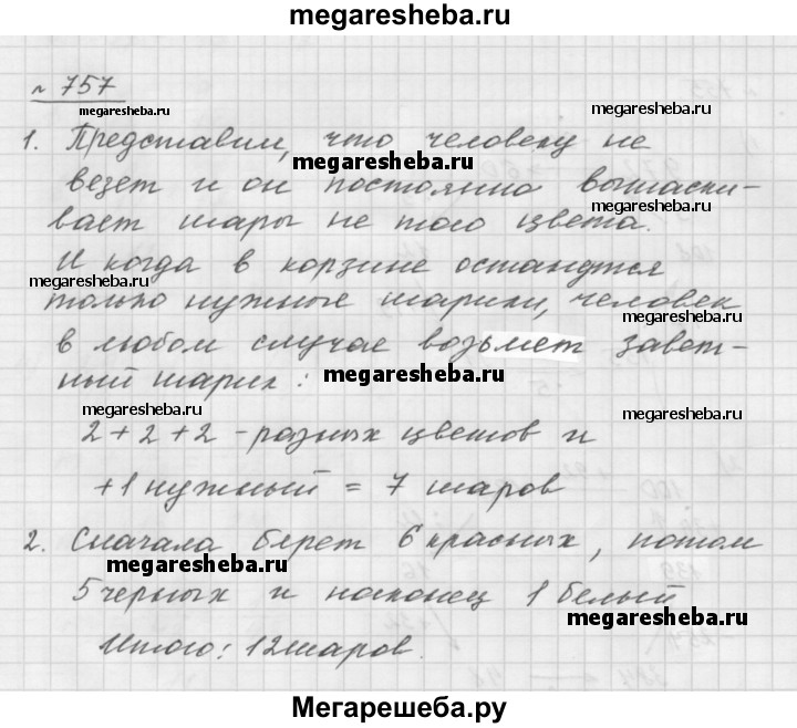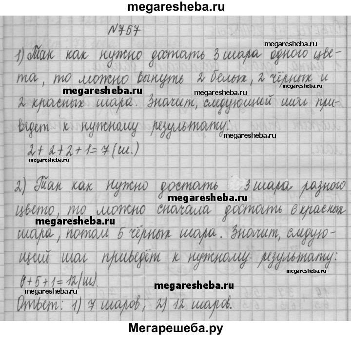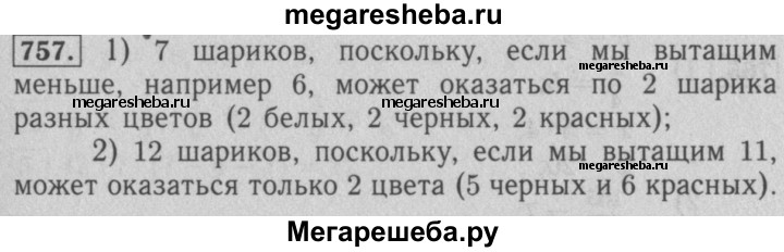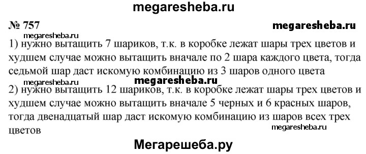 757. В коробке лежат 4 белых, 5 чёрных и 6 красных шаров. Какое наименьшее количество шаров надо вынуть из коробки, чтобы среди них обязательно оказались: 1) 3 шара одного цвета; 2) шары всех трёх цветов?