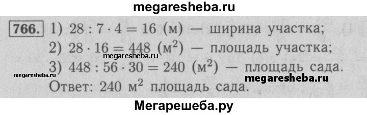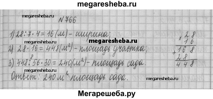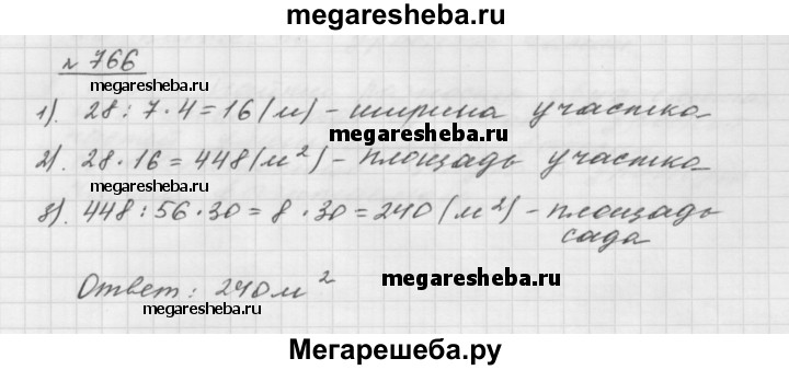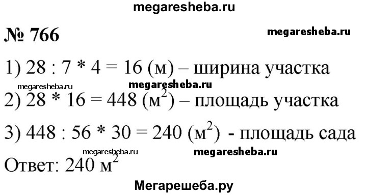 766. У фермера Петра Грушина есть участок земли прямоугольной формы. Длина участка равна 28 м, что составляет 7/4 его ширины. На площади, равной 30/56 всего участка, фермер разбил яблоневый сад. Найдите площадь сада.?