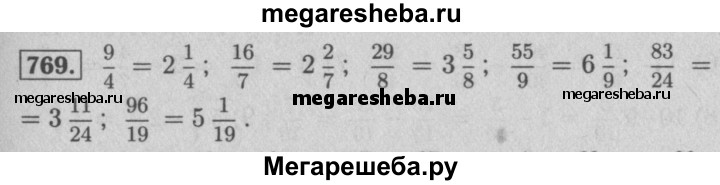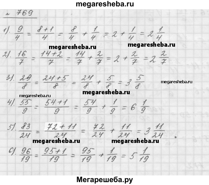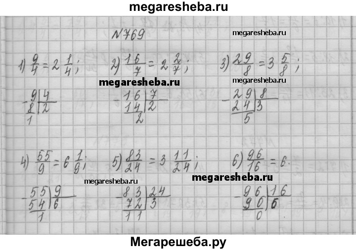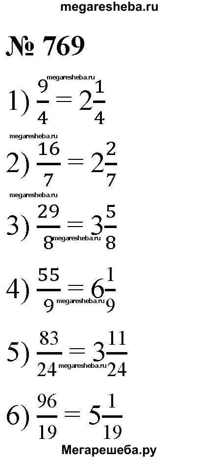 769. Преобразуйте неправильную дробь в смешанное число: 1) 9/4; 2)16/7; 3)29/8; 4)55/9; 5)83/24; 6) 96/19.