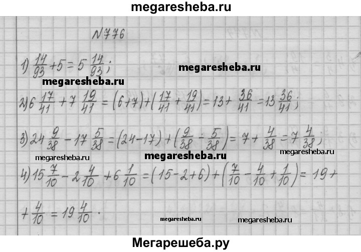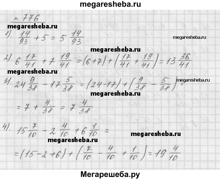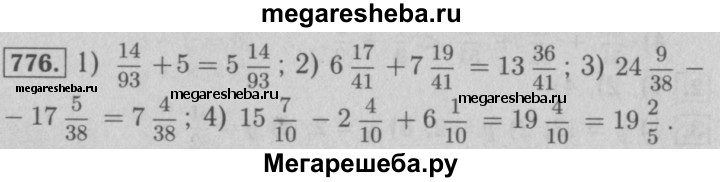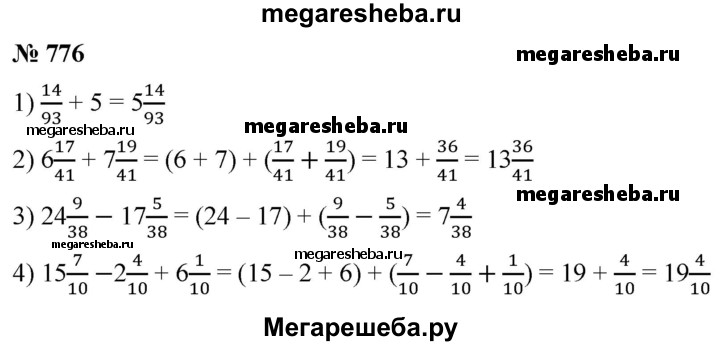 776. Выполните действия: 1) 14/93 + 5; 2) 6 17/41 + 7 19/41; 3) 24 9/38 – 17 5/38; 4) 15 7/10 – 2 4/10 + 6 1/10.