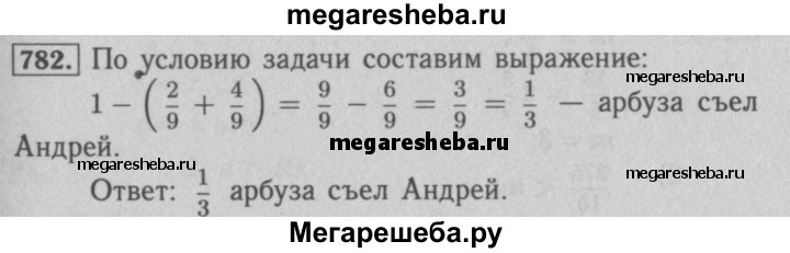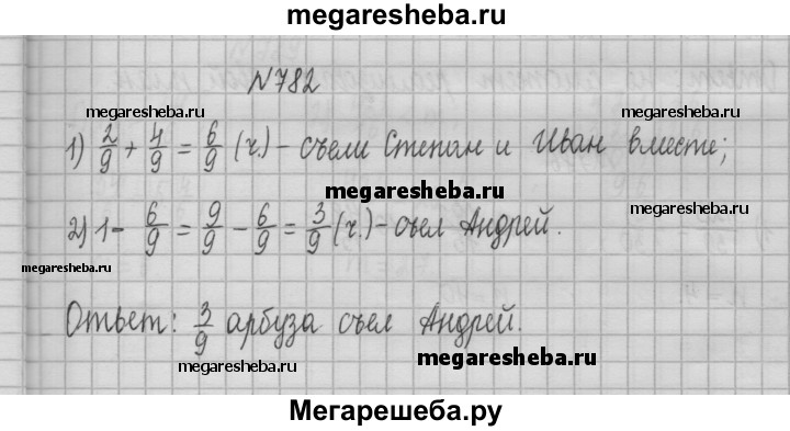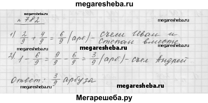 782. Степан, Иван и Андрей съели арбуз. Степан съел 2/9 арбуза, Иван — 4/9. Какую часть арбуза съел Андрей?