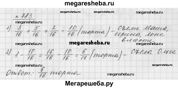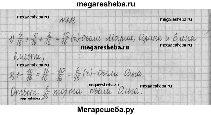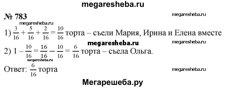 78З. Мария, Ирина, Елена и Ольга съели торт. Мария съела 3/16 торта, Ирина – 5/16, Елена – 2/16. Какую часть торта съела Ольга ?