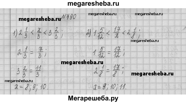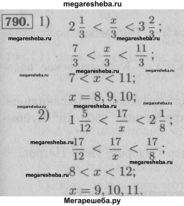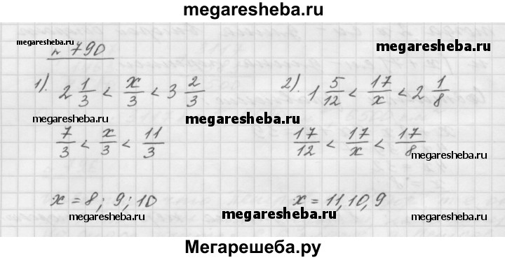 790. Найдите все натуральные значения х, при которых верно неравенство: 1) 2 1/3 < x/3 < 3 2/3; 2) 1 5/12 < 17/x < 2 1/8.