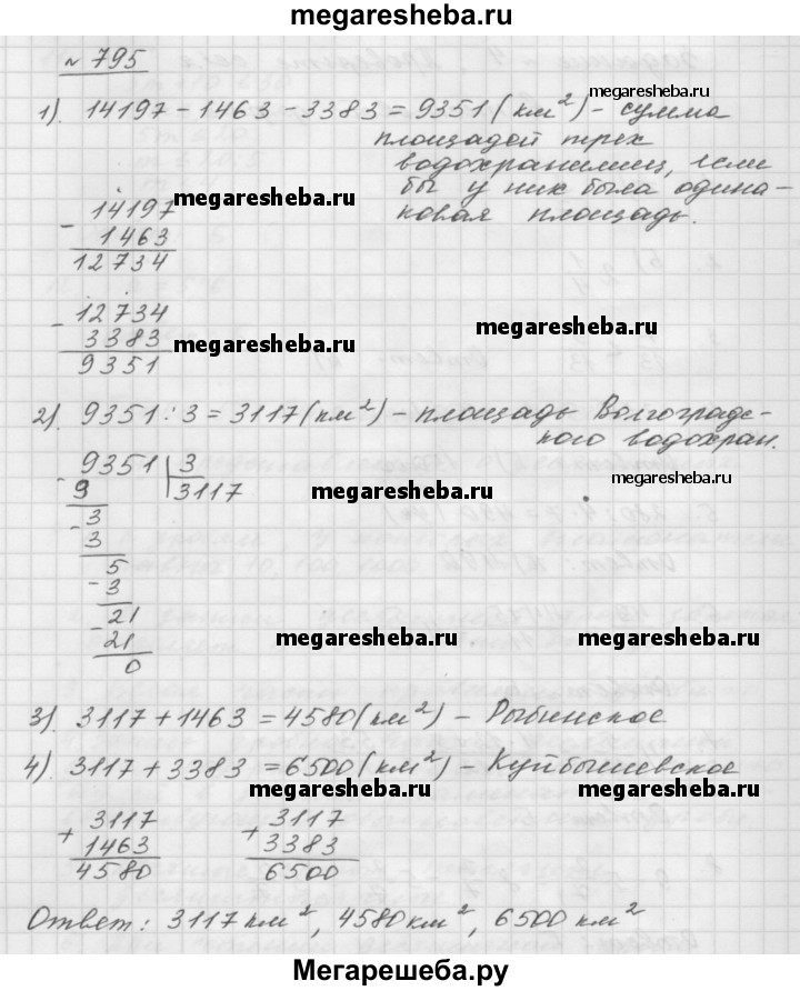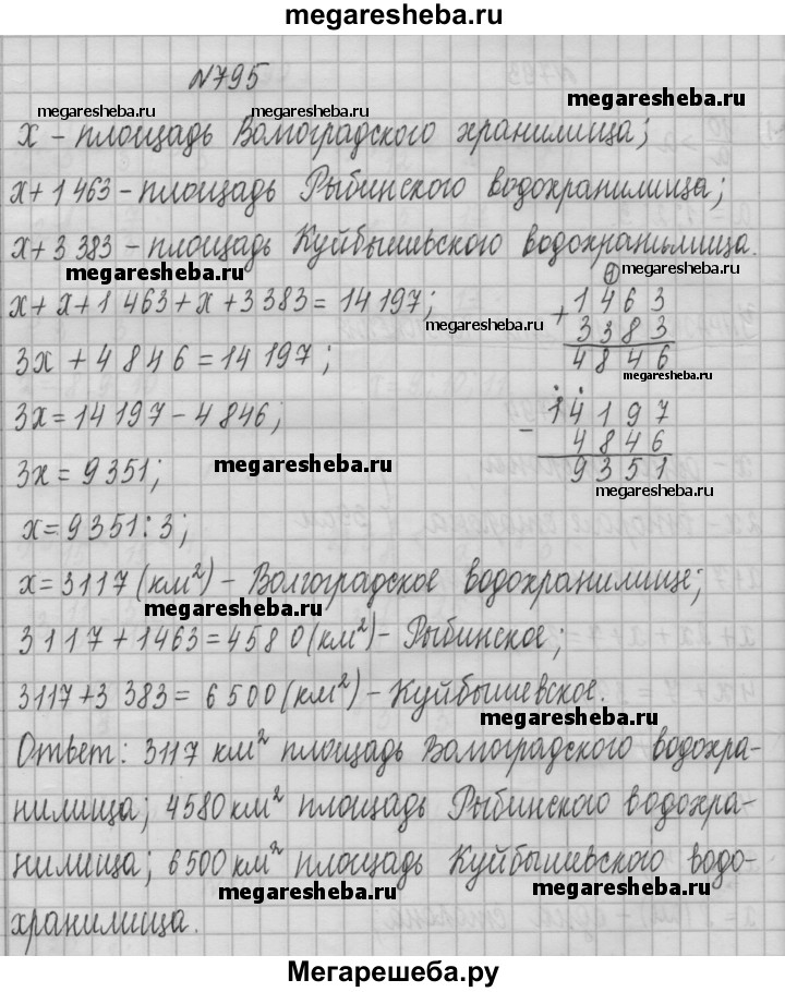 795. Общая площадь трёх крупнейших волжских водохранилищ Куйбышевского, Рыбинского и Волгоградского составляет 14 197 км^2. Площадь Волгоградского водохранилища на 1 463 км^2 меньше площади Рыбинского водохранилища и на 3 383 км^2 меньше площади Куйбышевского водохранилища. Найдите площадь каждого водохранилища.