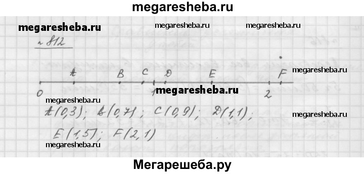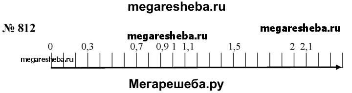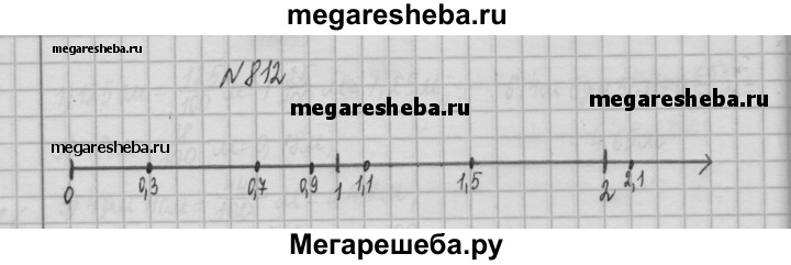 812. Начертите координатный луч, взяв за единичный такой отрезок, длина которого в десять раз больше стороны клетки тетради. Отметьте на луче точки, соответствующие числам 0,3; 0,7; 0,9; 1,1; 1,5; 2,1.