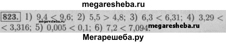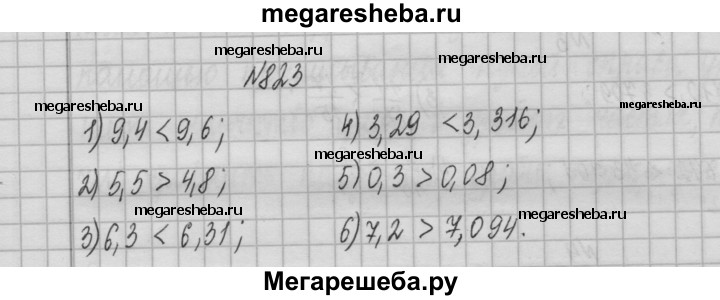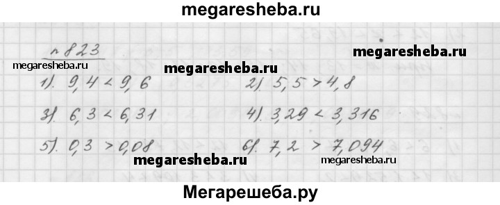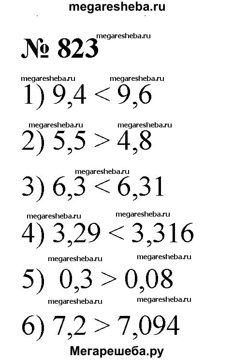 823. Сравните числа: 1) 9,4 и 9,6; 2) 5,5 и 4,8; 3) 6,3 и 6,31; 4) 3,29 и 3,316; 5) 0,3 и 0,08; 6) 7,2 и 7,094.