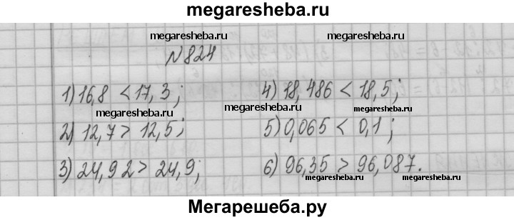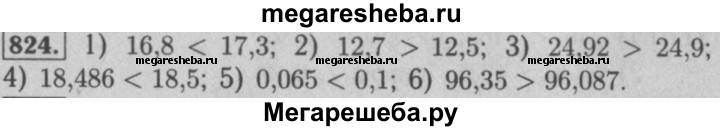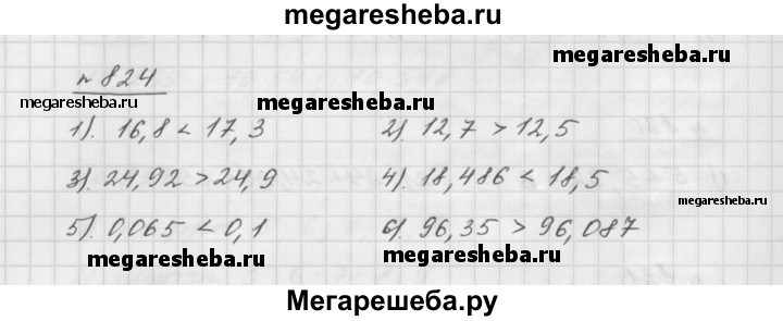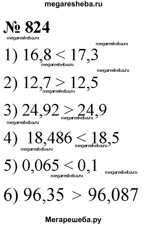 824. Сравните числа: 1) 16,8 и 17,3; 2) 12,7 и 12,5; 3) 24,92 и 24,9; 4) 18,486 и 18,5; 5) 0,065 и 0,1; 6) 96,35 и 96,087.
