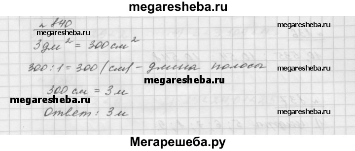 840. Картонный прямоугольник, площадь которого равна 3 дм^2, а длины сторон выражаются целым числом сантиметров, разрезали на полоски шириной 1 см и сложили из них одну длинную полоску. Какой длины получилась полоска?