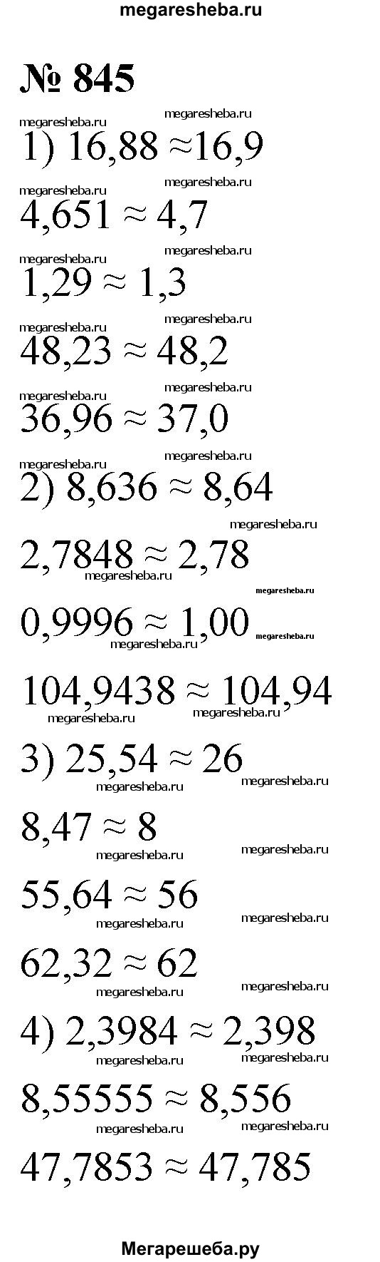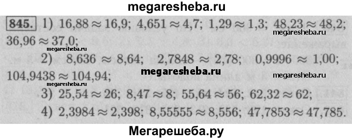 845. Округлите: 1) до десятых: 16,88; 4,651; 1,29; 48,23; 36,96; 2) до сотых: 8,636; 2,7848; 0,9996; 104,9438; 3) до единиц: 25,54; 8,47; 55,64; 62,32; 4) до тысячных: 2,3984; 8,55555; 47,7853.