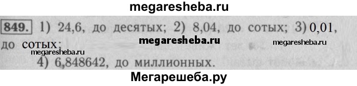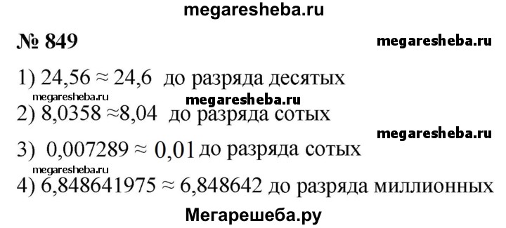 849. Округлите десятичные дроби, отбросив выделенные цифры, и укажите, до какого разряда выполнено округление: 1) 24,56; 2)8,0358; 3)0,007289; 4)6,848641975.