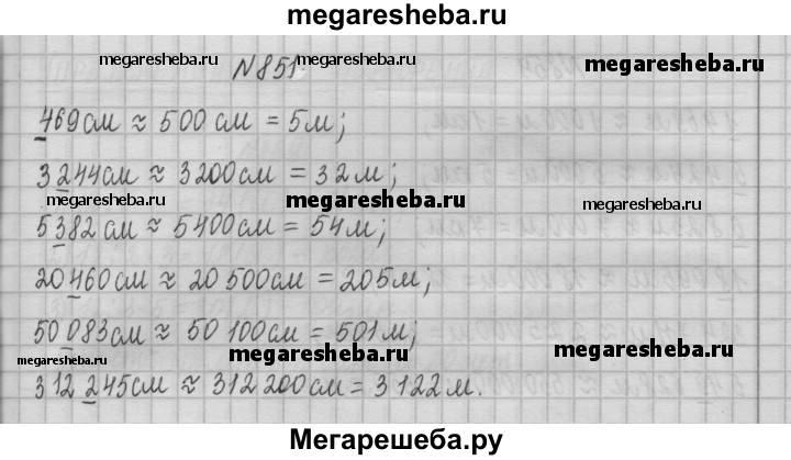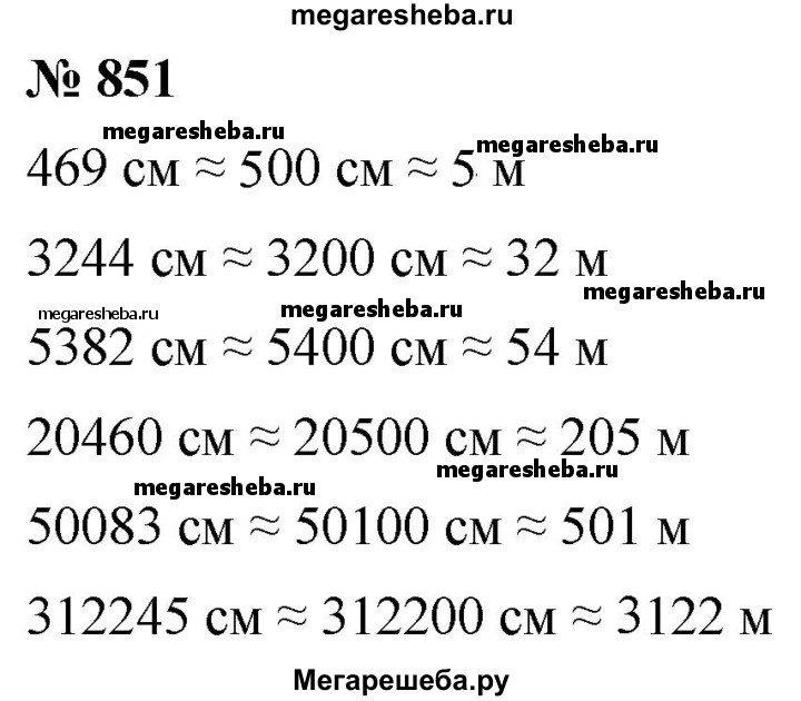 851. Запишите в метрах, предварительно округлив до сотен сантиметров: 469 см; 3 244 см; 5 382 см; 20 460 см; 50 083 см; 312 245 см.