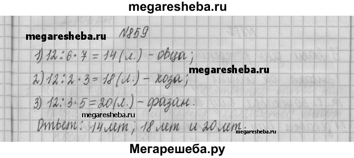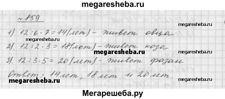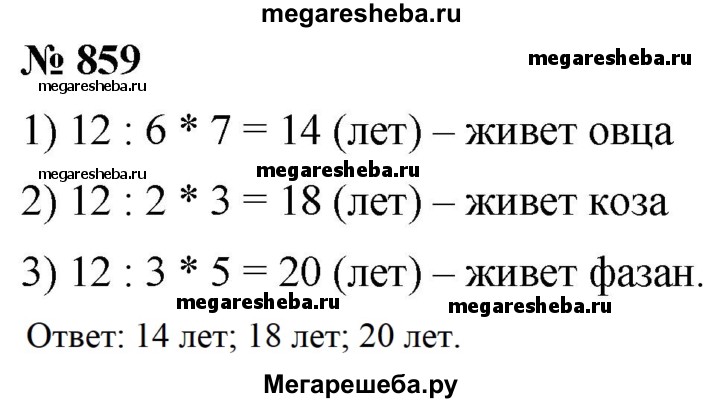 859. Кролик живёт до 12 лет, что составляет: 1) 6/7 продолжительности жизни овцы; 2) 2/3 продолжительности жизни козы; 3) 3/5 продолжительности жизни фазана. Найдите продолжительность жизни овцы, козы и фазана.