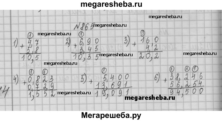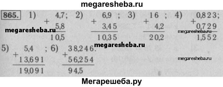 865. Выполните сложение: 1) 4,7 + 5,8; 2) 6,9 + 3,45; 3) 16 + 4,2; 4) 0,823 + 0,729; 5) 5,4 + 13,691; 6) 38,246 + 56,254.