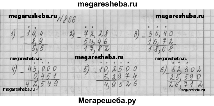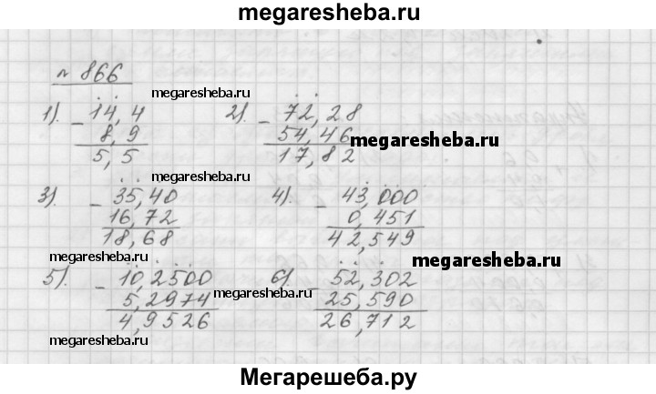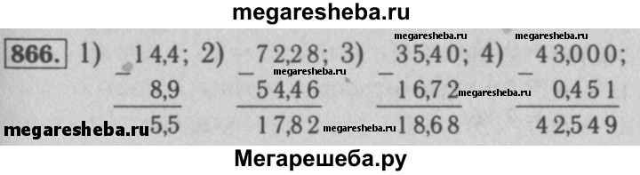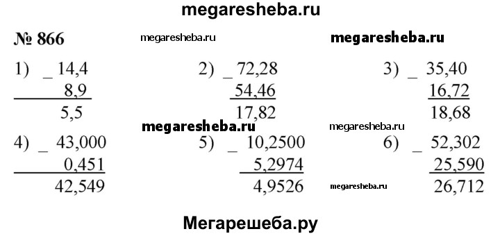 866. Выполните вычитание: 1) 14,4-8,9; 2) 72,28 - 54,46; 3) 35,4- 16,72; 4) 43-0,451; 5) 10,25 - 5,2974; 6) 52,302 - 25,59.