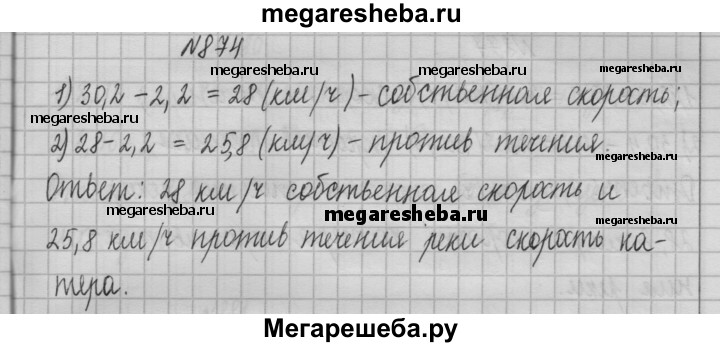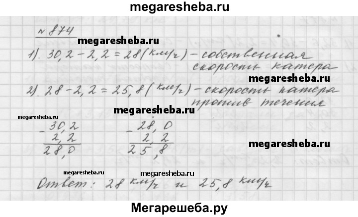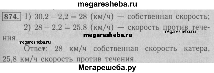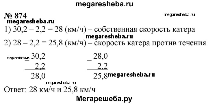 874. Скорость катера по течению реки равна 30,2 км/ч, а скорость течения — 2,2 км/ч. Найдите собственную скорость катера и его скорость против течения.