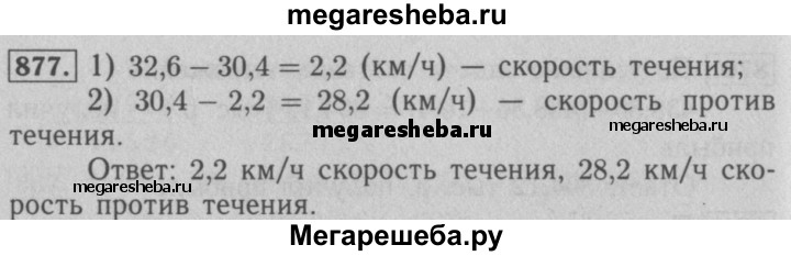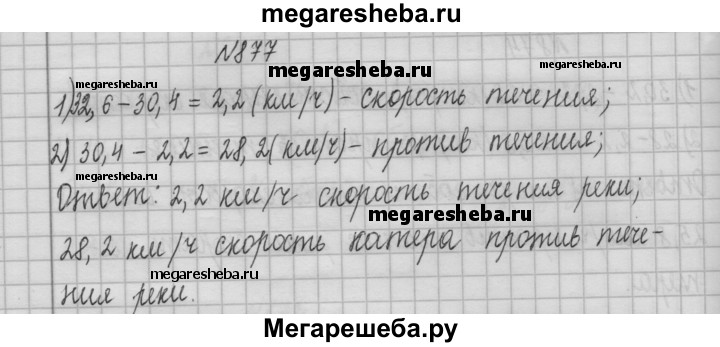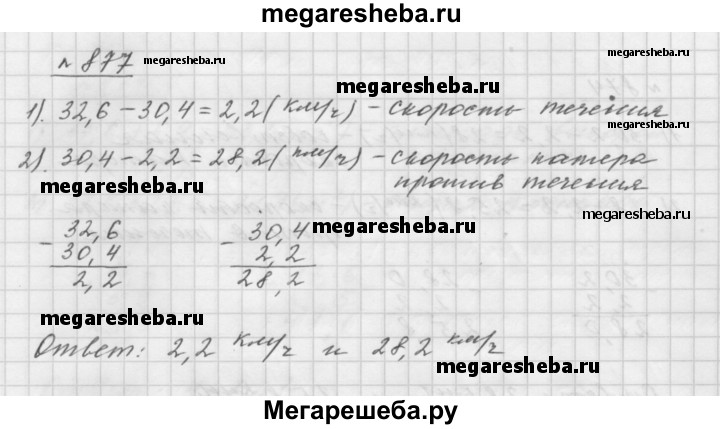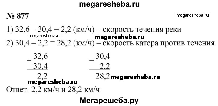 877. Скорость катера по течению реки равна 32,6 км/ч, а его собственная скорость — 30,4 км/ч. Найдите скорость течения и скорость катера против течения реки.