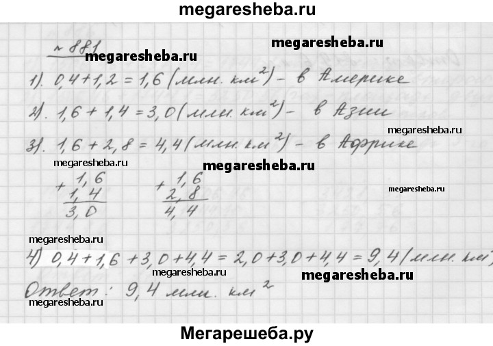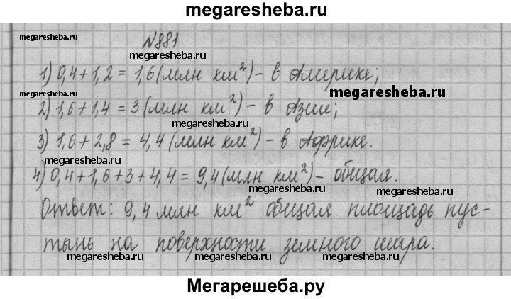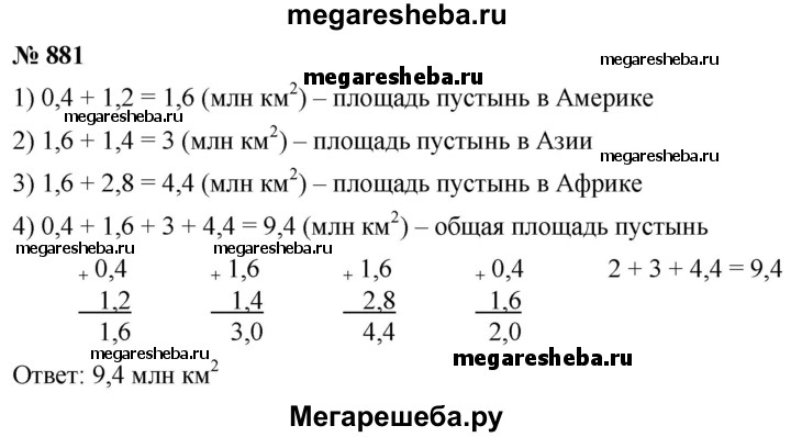 881. Найдите общую площадь пустынь на поверхности земного шара, если площадь пустынь в Австралии равна 0,4 млн км^2, в Америке — на 1,2 млн км2 больше, чем в Австралии, в Азии — на 1,4 млн км^2 больше, чем в Америке, а в Африке — на 2,8 млн км^2 больше, чем в Америке.