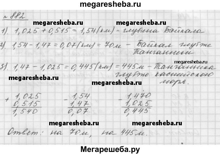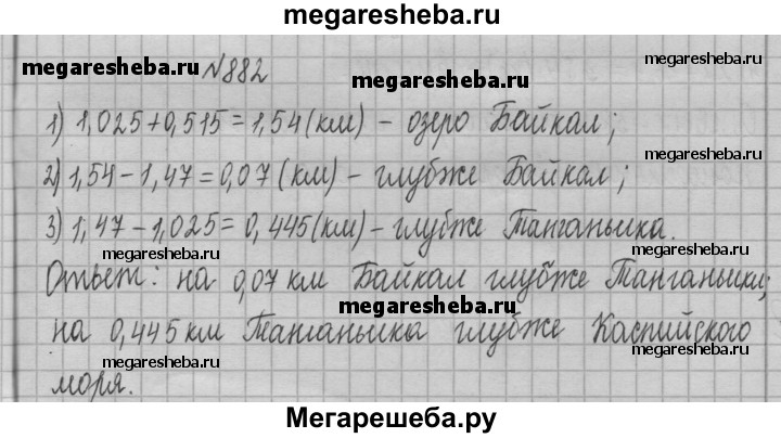 882. Наибольшее озеро в мире — Каспийское море — имеет глубину 1,025 км. Озеро Байкал — самое глубокое в мире. Его глубина на 0,515 км больше глубины Каспийского моря. Глубина озера Танганьика (Африка) составляет 1,47 км. На сколько Байкал глубже Танганьики, а Танганьика глубже Каспийского моря?