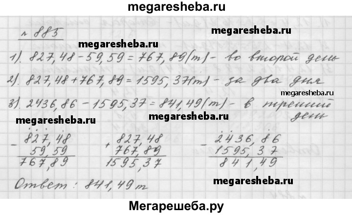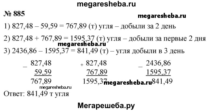 885. За три дня на шахте добыли 2 436,86 т угля. За первый день добыча составляла 827,48 т, а за второй — на 59,59 т меньше, чем за первый. Сколько тонн угля добыли за третий день?