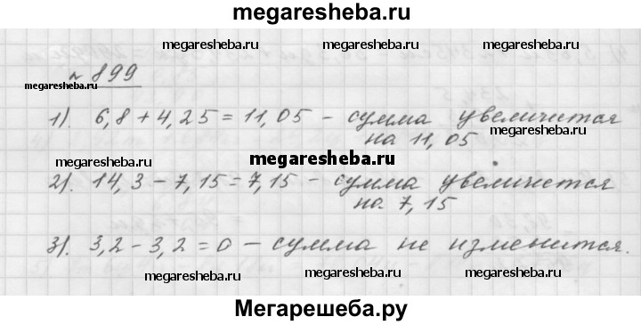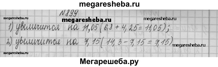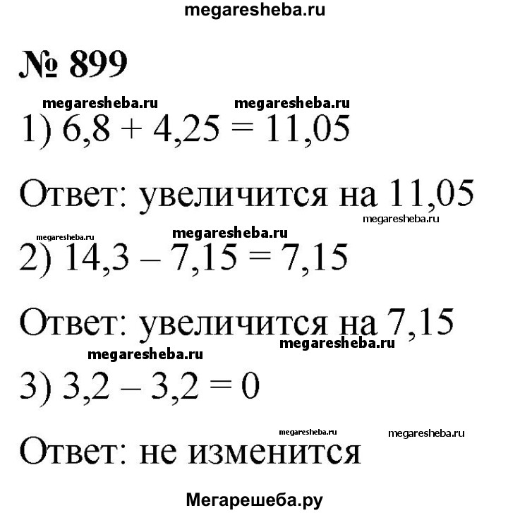 899. Как изменится сумма, если: 1) одно из слагаемых увеличить на 6,8, а второе — на 4,25; 2) одно из слагаемых увеличить на 14,3, а второе уменьшить на 7,15; 3) одно из слагаемых увеличить на 3,2, а второе уменьшить на 3,2?