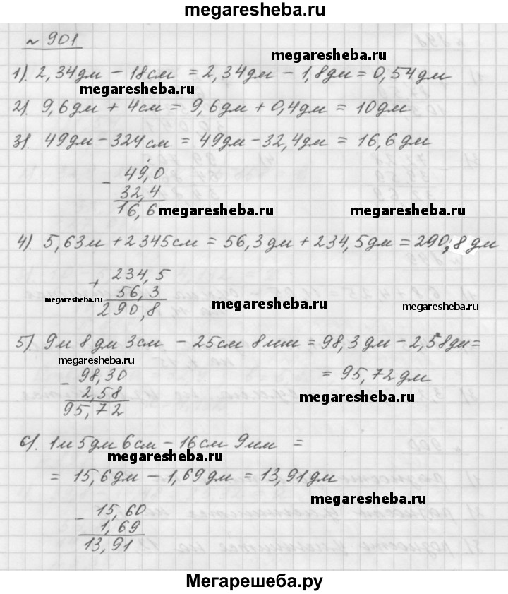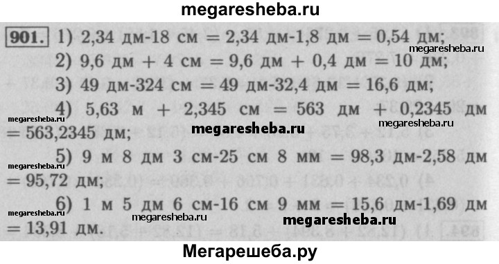 901. Выразите данные величины в дециметрах и выполните действия: 1) 2,34 дм - 18 см; 2) 9,6 дм + 4 см; 3) 49 дм - 324 см; 4) 5,63 м + 2 345 см; 5) 9 м 8 дм 3 см - 25 см 8 мм; 6) 1 м 5 дм 6 см - 16 см 9 мм.