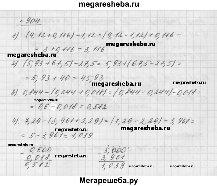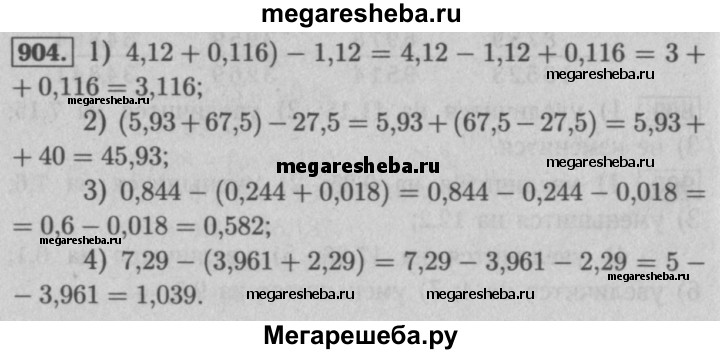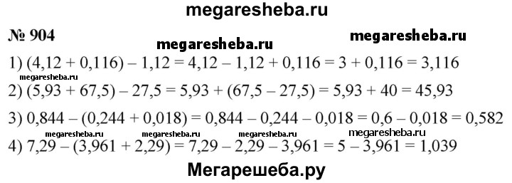 904. Найдите значение выражения, выбирая удобный порядок вычислений: 1) (4,12 + 0,116) - 1,12; 2) (5,93 + 67,5) - 27,5; 3) 0,844 - (0,244 + 0,018); 4) 7,29 - (3,961 + 2,29).