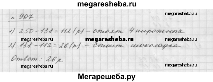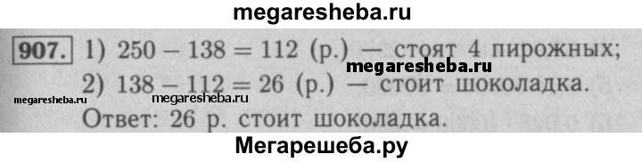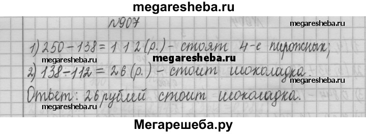 907. За шоколадку и четыре пирожных заплатили 138 р., а за такую же шоколадку и восемь таких пирожных — 250 р. Сколько рублей стоит шоколадка?