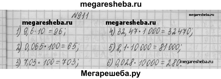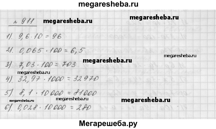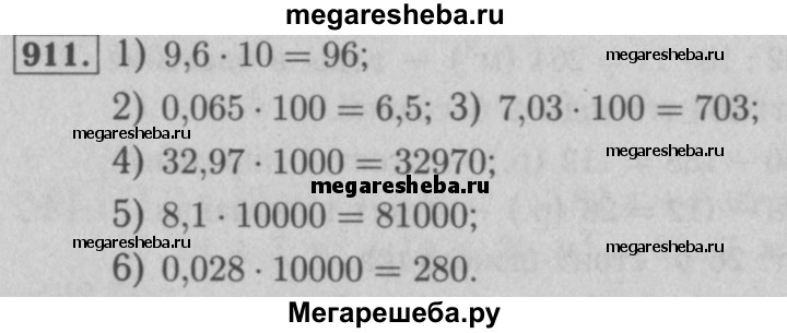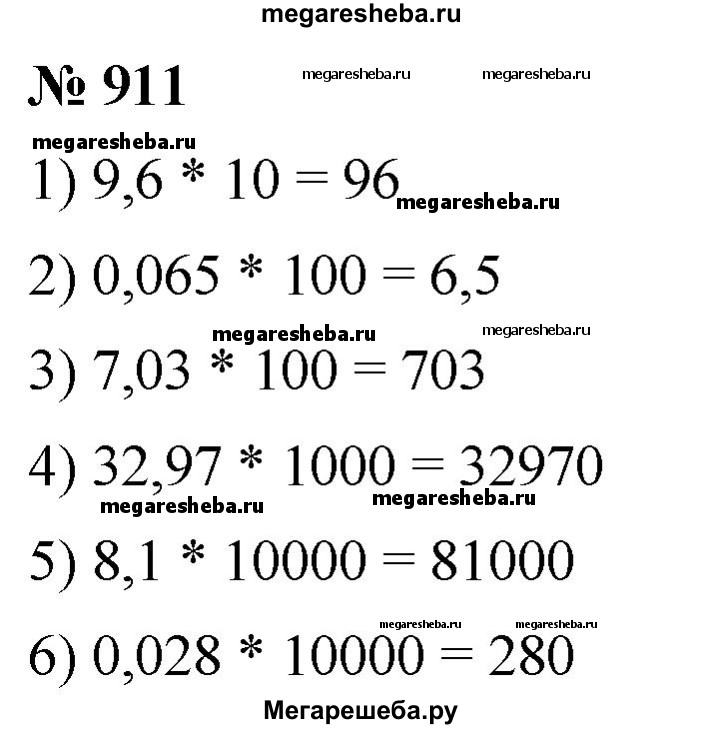 911 Выполните умножение: 1) 9,6 • 10; 2) 0,065 • 100; 3) 7,03 • 100; 4) 32,97 • 1 000; 5) 8,1 • 10 000; 6) 0,028 • 10 000.