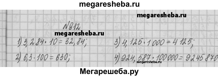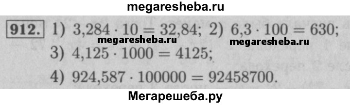 912. Выполните умножение: 1) 3,284 • 10; 2) 6,3 • 100; 3) 4,125 • 1 000; 4) 924,587 • 100 000.