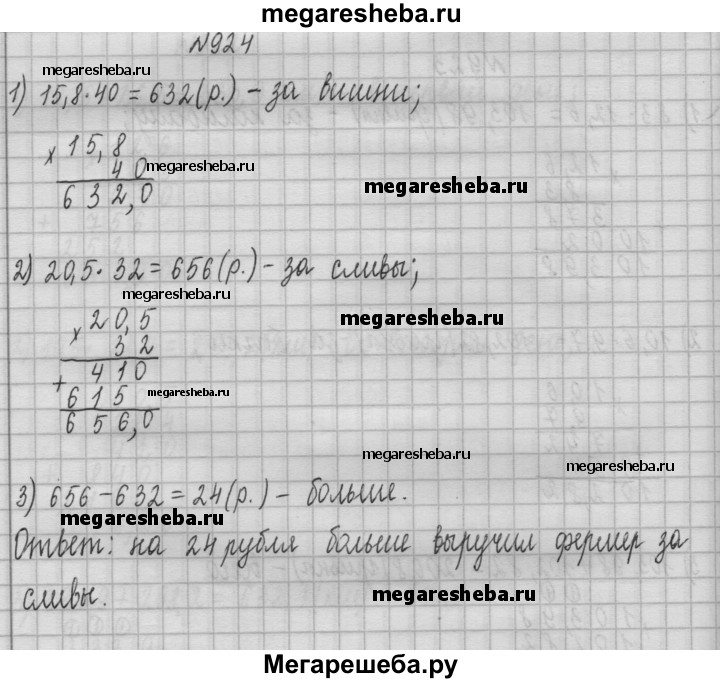 924. Фермер продал 15,8 кг вишен по 40 р. за килограмм и 20,5 кг слив по 32 р. за килограмм. За какие фрукты он выручил больше денег и на сколько рублей?