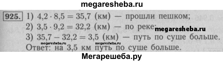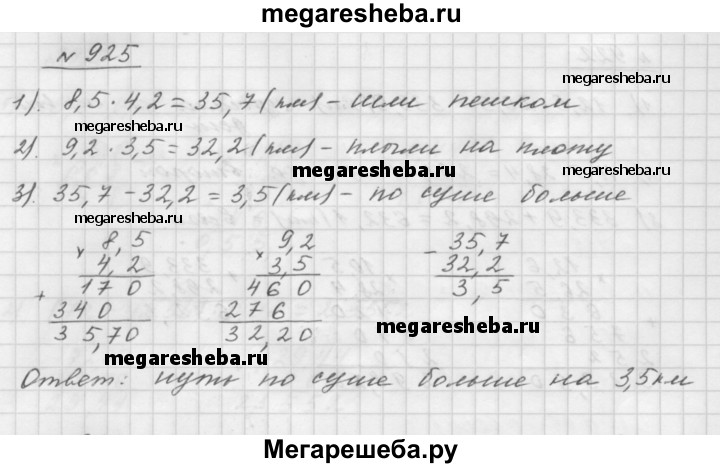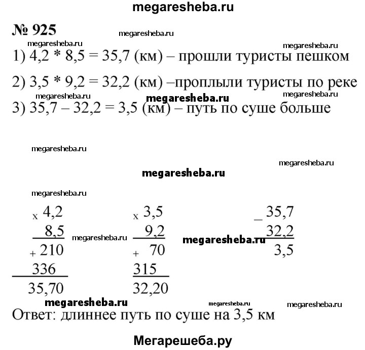 925. В походе группа туристов 8,5 ч шла пешком со скоростью 4,2 км/ч и 9,2 ч плыла по реке на плоту со скоростью 3,5 км/ч. Какое из расстояний, преодолённых туристами, — по суше или по реке — больше и на сколько километров?
