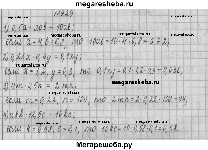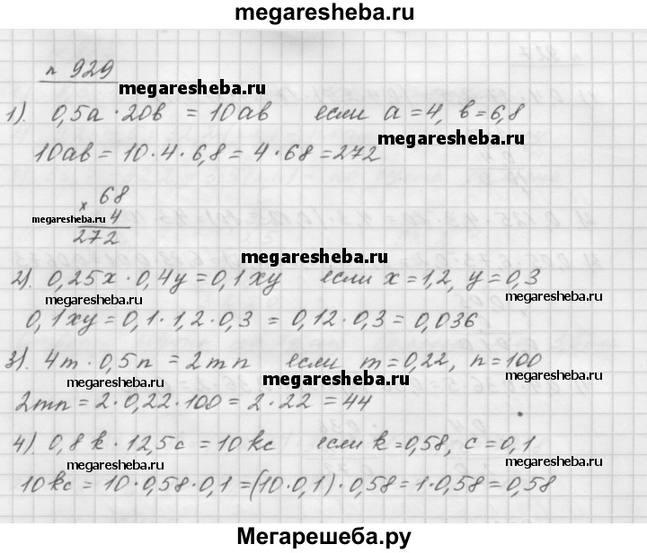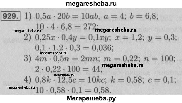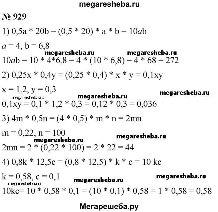 929. Упростите выражение и найдите его значение: 1) 0,5a • 20b, если а = 4, b = 6,8; 2) 0,25x • 0,4y, если x = 1,2, у = 0,3; 3) 4m • 0,5n если m = 0,22, n = 100; 4) 0,8k • 12,5с, если k= 0,58, с = 0,1.