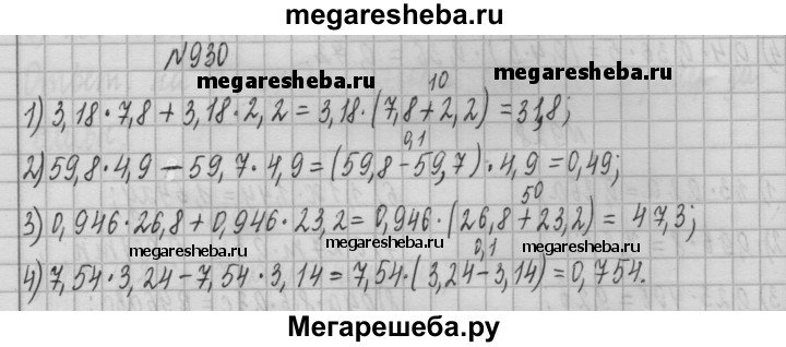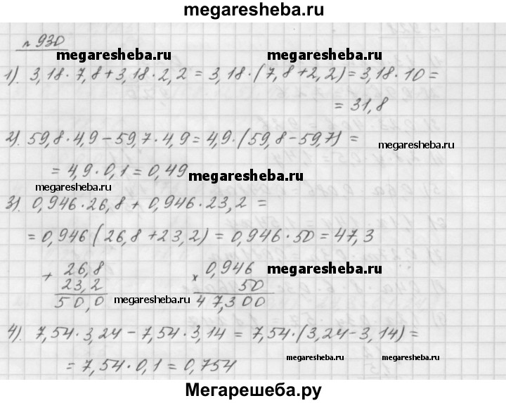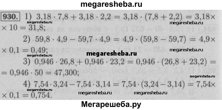 930. Вычислите значение выражения наиболее удобным способом: 1) 3,18 • 7,8 + 3,18 • 2,2; 2) 59,8 • 4,9 - 59,7 • 4,9; 3) 0,946 • 26,8 + 0,946 • 23,2; 4) 7,54 • 3,24 - 7,54 • 3,14.