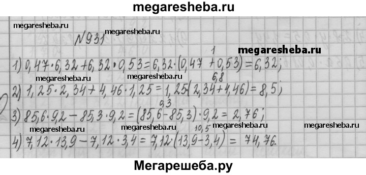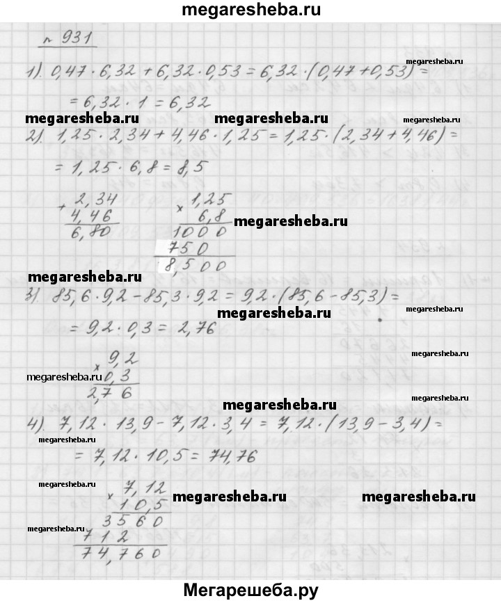 931. Вычислите значение выражения наиболее удобным способом: 1) 0,47 • 6,32 + 6,32 • 0,53; 2) 1,25 • 2,34 + 4,46 • 1,25; 3) 85,6 • 9,2 - 85,3 • 9,2; 4) 7,12 • 13,9 - 7,12 • 3,4.