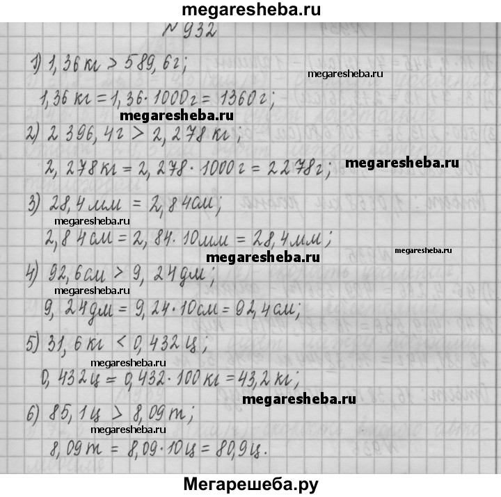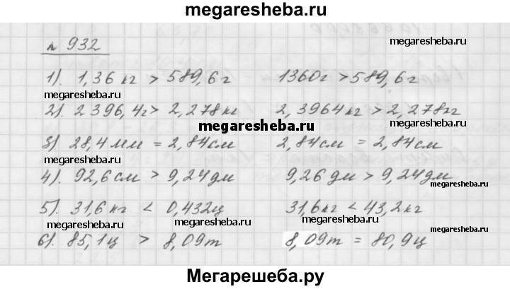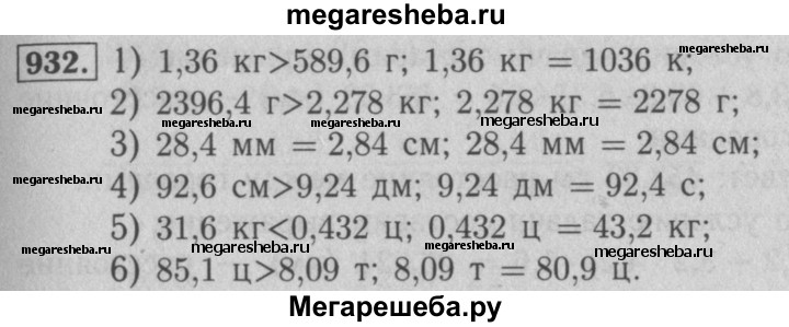 932. Выразите величины в одинаковых единицах измерения и сравните их: 1) 1,36 кг и 589,6 г; 2) 2 396,4 г и 2,278 кг; 3) 28,4 мм и 2,84 см; 4) 92,6 см и 9,24 дм; 5) 31,6 кг и 0,432 ц 6) 85,1 ц и 8,09 т.