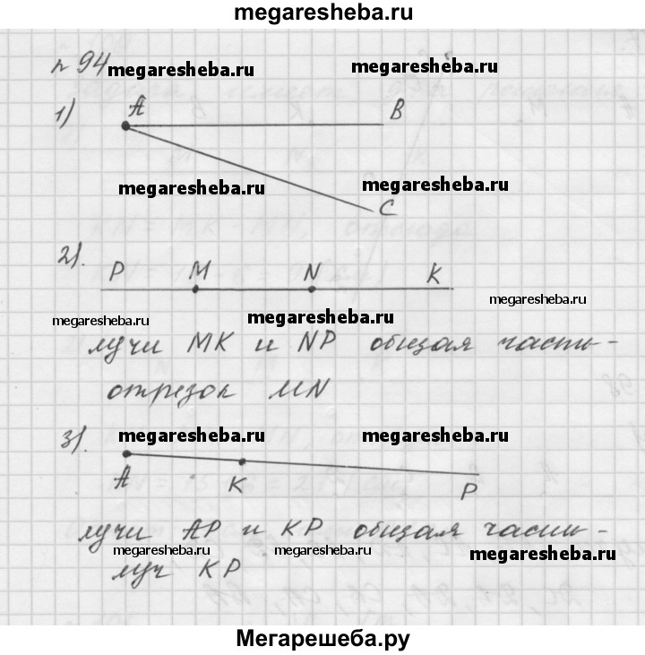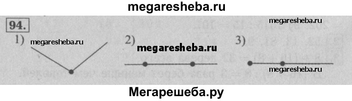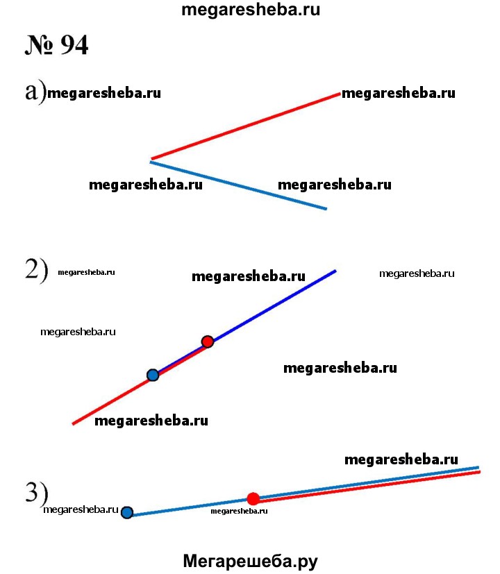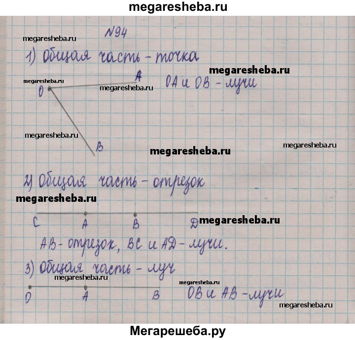 94. Начертите два луча так, чтобы их общая часть была: 1) точкой; 2) отрезком; 3) лучом.