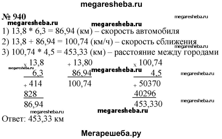 940. Из двух городов навстречу друг другу одновременно выехали велосипедист и легковой автомобиль. Велосипедист ехал со скоростью 13,8 км/ч, а автомобиль — в 6,3 раза быстрее. Найдите расстояние между городами, если велосипедист и автомобиль встретились через 4,5 ч после начала движения.