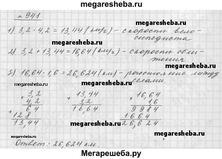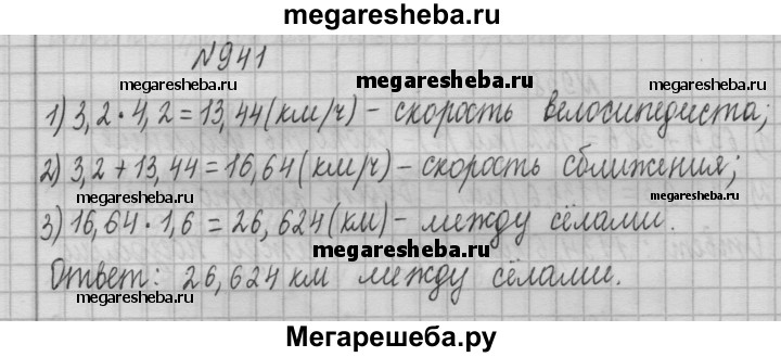 941. Из двух сёл навстречу друг другу одновременно начали движение велосипедист и пешеход. Пешеход шёл со скоростью 3,2 км/ч, что в 4,2 раза меньше скорости велосипедиста. Найдите расстояние между сёлами, если велосипедист и пешеход встретились через 1.6 ч после начала движения.