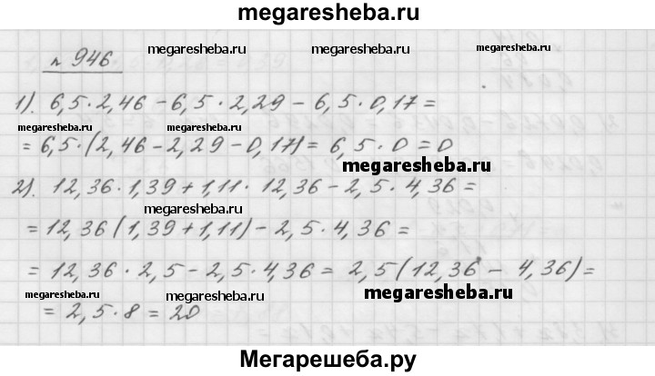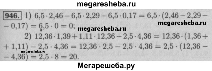 946. Вычислите значение выражения наиболее удобным способом: 1) 6,5 • 2,46 - 6,5 • 2,29 - 6,5 • 0,17; 2) 12,36 • 1,39 + 1,11 • 12,36 - 2,5 • 4,36.