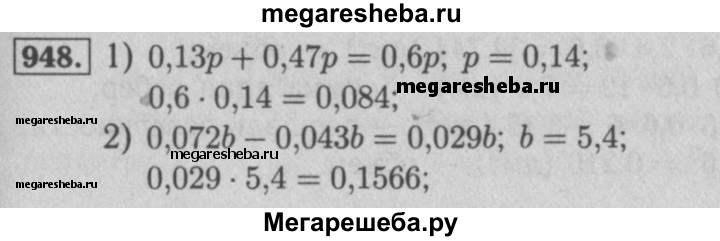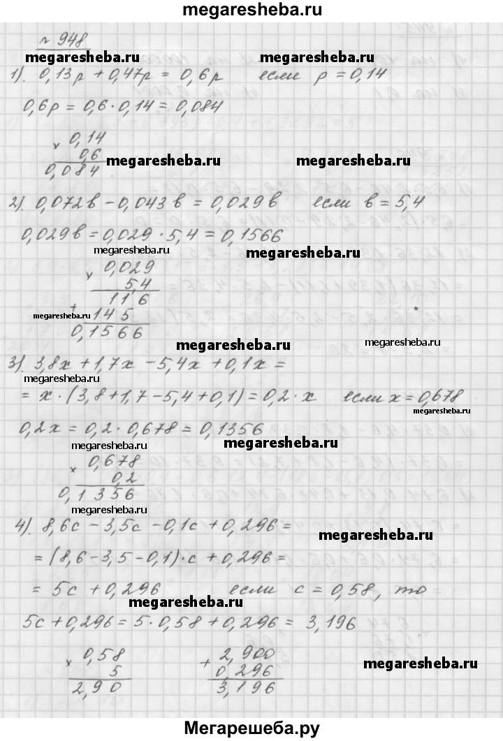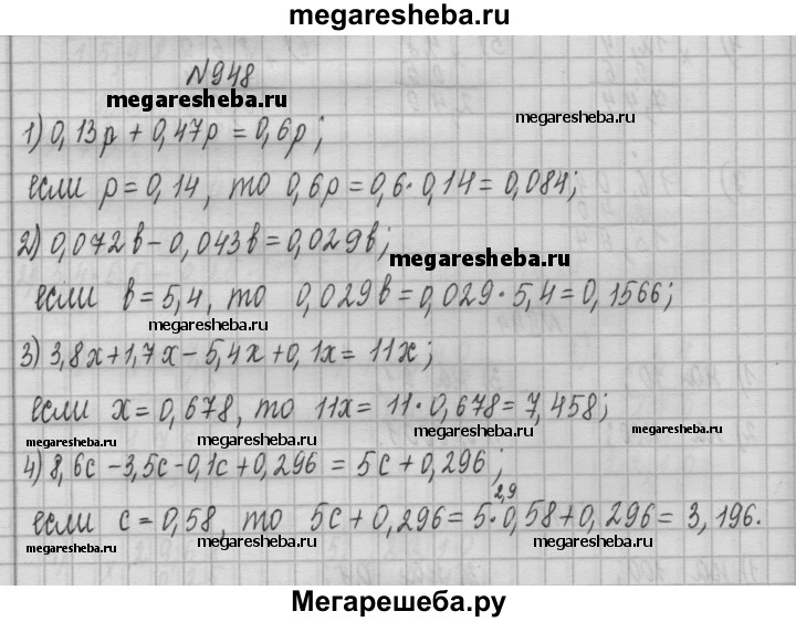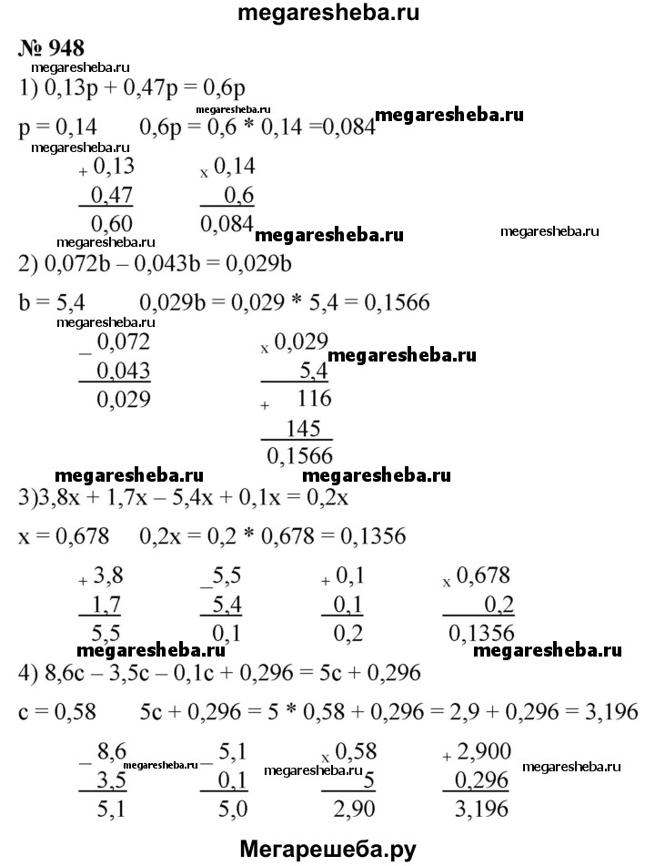 948. Упростите выражение и найдите его значение: 1) 0,13p+ 0,47p, если p = 0,14; 2) 0,072b- 0,043b, если b = 5,4; 3) 3,8x + 1,7 x - 5,4 x + 0,1 x, если x = 0,678; 4) 8,6с - 3,5с - 0,1с + 0,296, если с = 0,58.