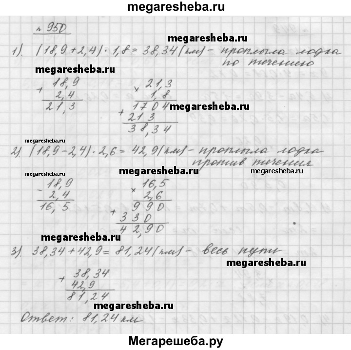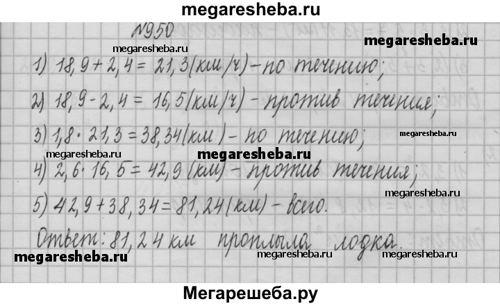 950. Лодка плыла 1,8 ч по течению реки и 2,6 ч против течения. Какой путь проплыла лодка за всё время движения, если скорость течения равна 2,4 км/ч, а собственная скорость лодки — 18,9 км/ч?