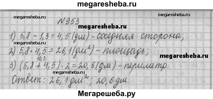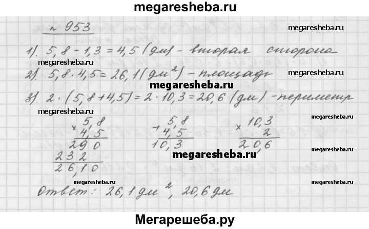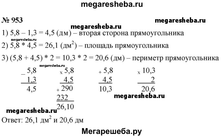 953. Одна из сторон прямоугольника равна 5,8 дм, что на 1,3 дм больше соседней стороны. Вычислите площадь и периметр прямоугольника.