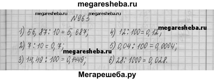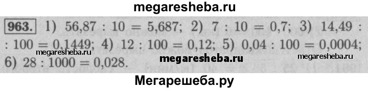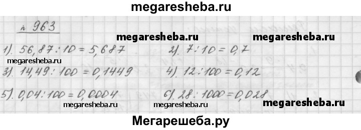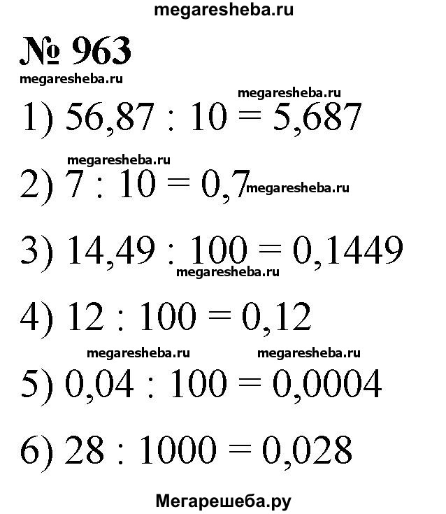 963. Выполните деление: 1) 56,87 : 10; 2) 7 : 10; 3) 14,49 : 100; 4) 12 : 100; 5) 0,04 : 100; 6) 28 : 1 000.