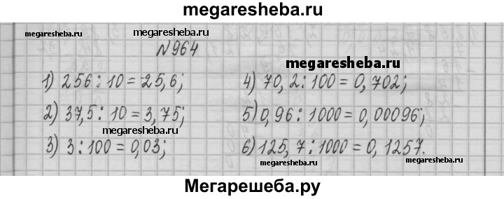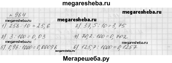 964. Выполните деление: 1) 256 : 10; 2) 37,5 : 10; 3) 3 : 100; 4) 70,2 : 100; 5) 0,96 : 1 000; 6) 125,7 : 1 000.