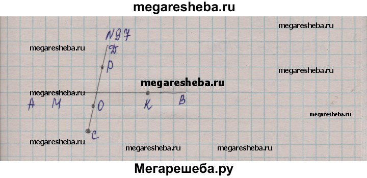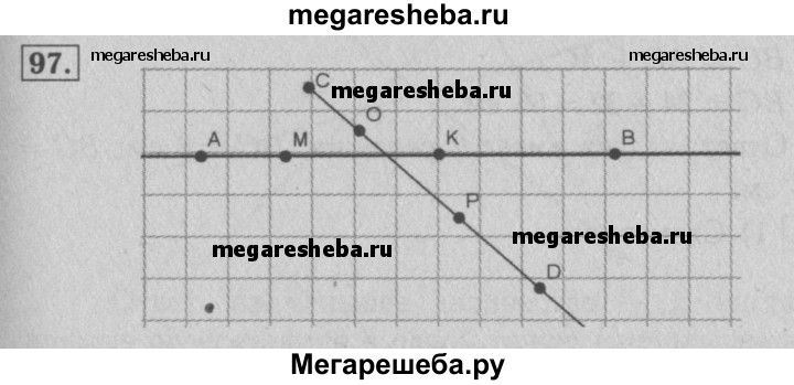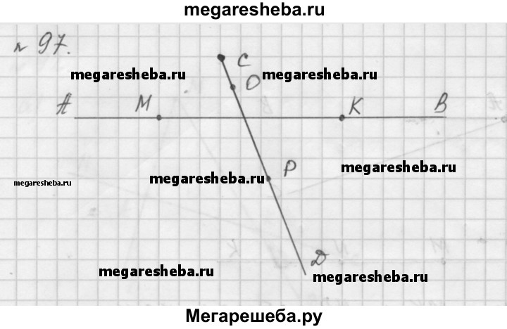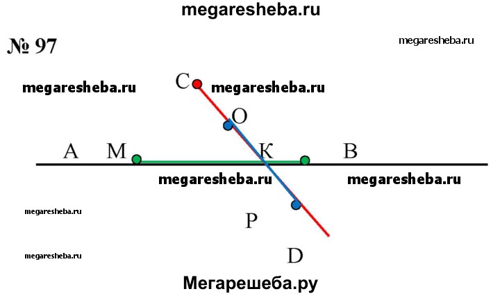 97. Начертите луч CD, прямую АВ и отрезки МК и ОР так, чтобы отрезок МК лежал на прямой АВ, отрезок ОР — на луче CD и чтобы прямая А В пересекала отрезок ОР, а луч CD — отрезок МК.