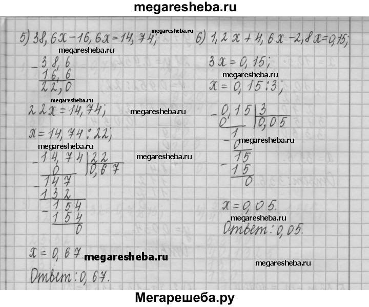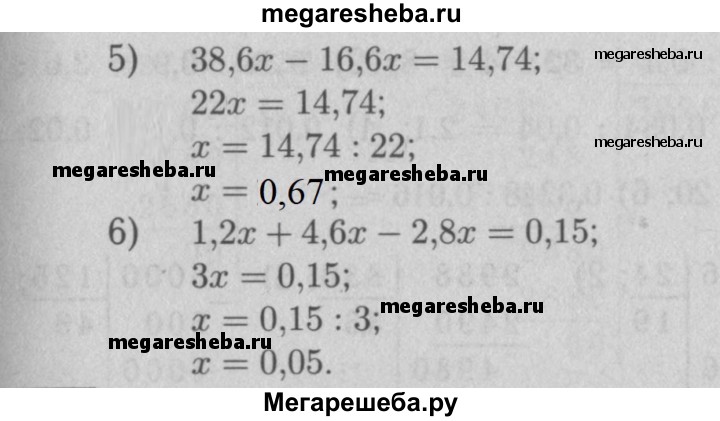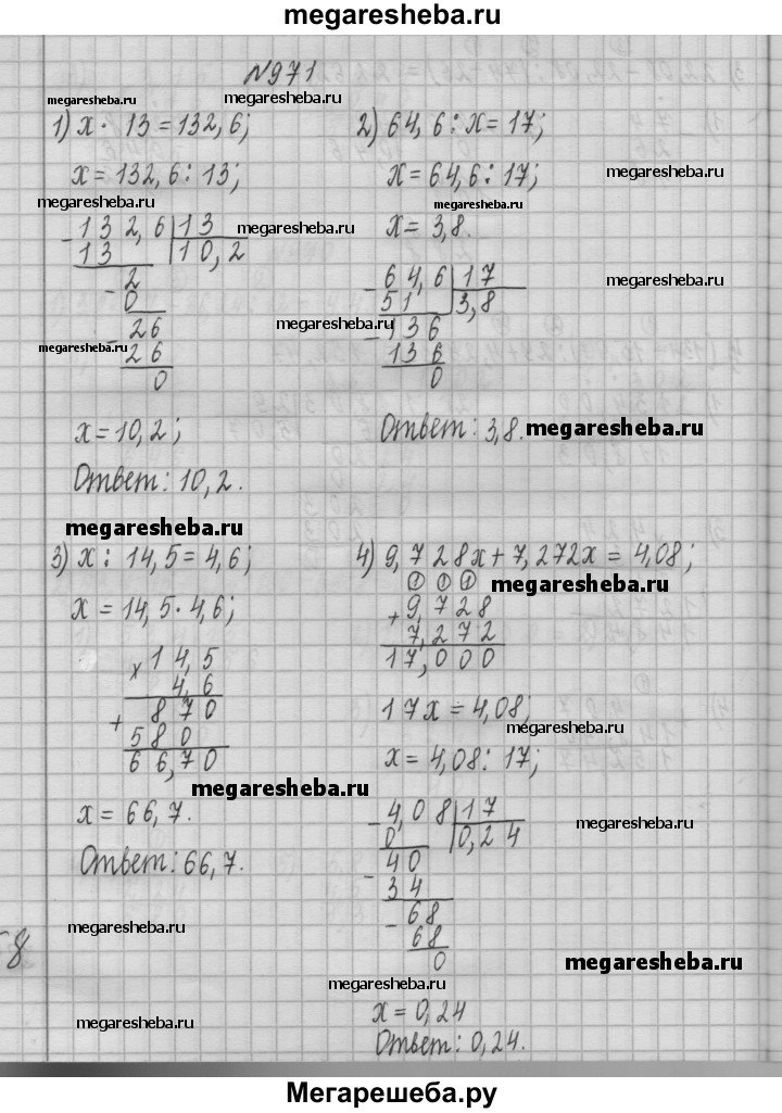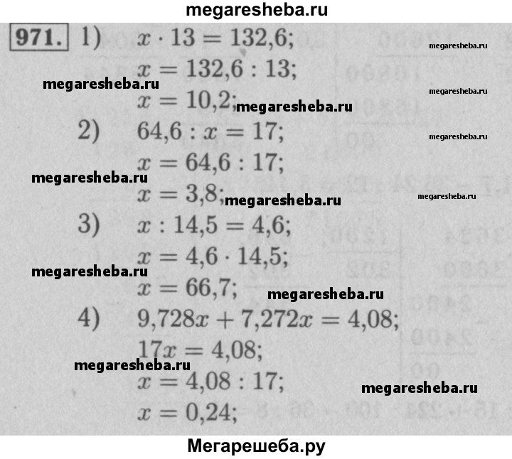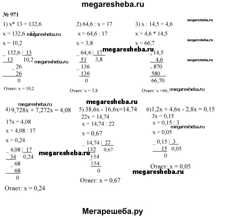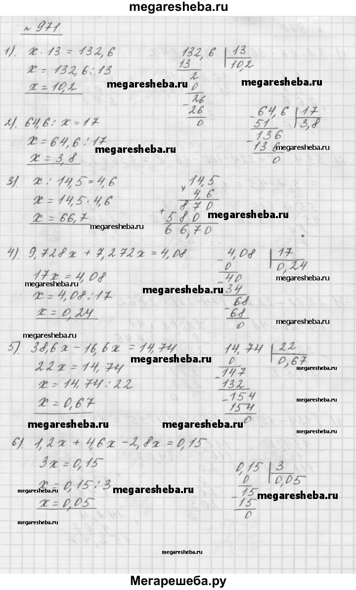 971. Решите уравнение: 1) x • 13 = 132,6; 2) 64,6 : x = 17; 3) x : 14,5 = 4,6; 4) 9,728x + 7,272x= 4,08; 5) 38,6x- 16,6x= 14,74; 6) 1,2x+4,6x-2,8x= 0,15.